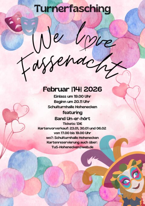 Fasching beim TuS 04 Hohenecken 2026 mit dem Motto "We love Fassenacht".