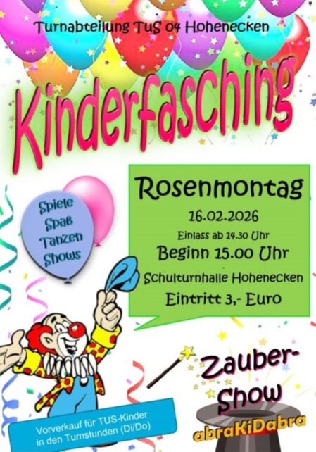 Unter dem stimmungsvollen Motto „We love Fassenacht“ lädt die Turn- und Gymnastikabteilung des TuS 04 Hohenecken auch in diesem Jahr wieder herzlich zu ihrer traditionellen Faschingsveranstaltung ein. Die Besucher erwartet am 14. Februar 2026 ab 20.11 Uhr ein abwechslungsreiches und unterhaltsames Programm voller mitreißender Auftritte, kreativer Darbietungen und jeder Menge guter Laune. Das Organisationsteam hat mit viel Engagement ein buntes Showprogramm auf die Beine gestellt, das für Jung und Alt gleichermaßen jede Menge Spaß garantiert. Von humorvollen Sketchen über tänzerische Highlights bis hin zu musikalischen Einlagen − die Gäste dürfen sich auf einen Abend freuen, der die Vielfalt und Lebensfreude der „Fassenacht“ in Hohenecken widerspiegelt.